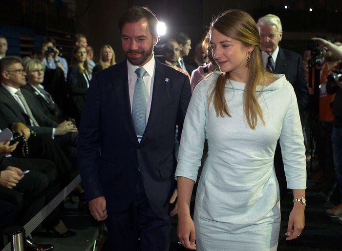 Groningen: Prinses Laurentien draagt een donkerblauwe kanten jurk met gele accenten van Talbot Runhof, gecombineerd met een geel leren jasje van Hardies Couture.